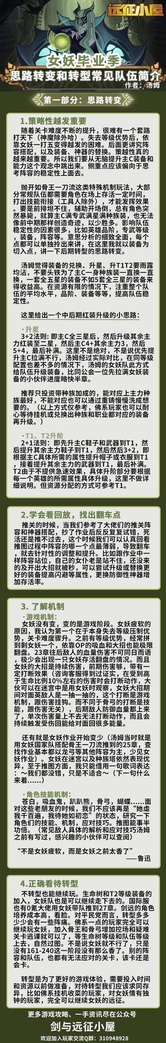 开场日常唠叨:最近汤圆(汤姆胖了)看到很多群里关于后期女妖转型这个话题的讨论越来越多。女妖失去等级优势后的疲软,是很多传统女妖队走过来的玩家都要面对的痛点。为此汤姆收集了一些素材,分别从思路转变和队伍转型两个角度简单探讨一下女妖转型这个话题,填一下昨天发表的帖子里挖的坑,希望能给大家些许帮助。(强调:女妖可以继续玩,不是一定要转型,要不要转型取决于自己。即便转型了,后期部分图用女妖依然很好过