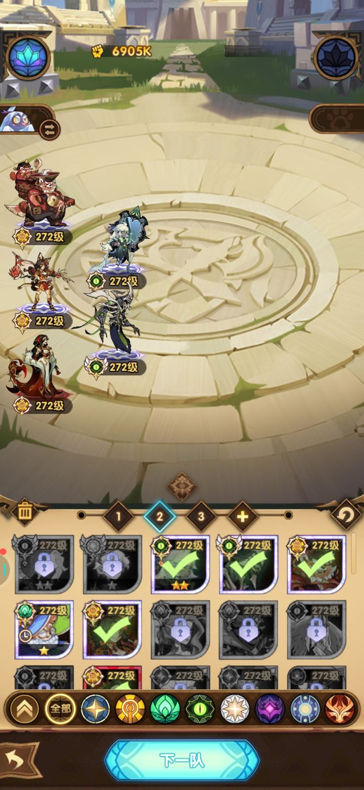 找大佬们帮忙了,阵容里面还可以多加一个紫色鹿头,求求大佬搭配一下,我自己搭始终只有3队稳一点,第4队稳不住了#剑与远征