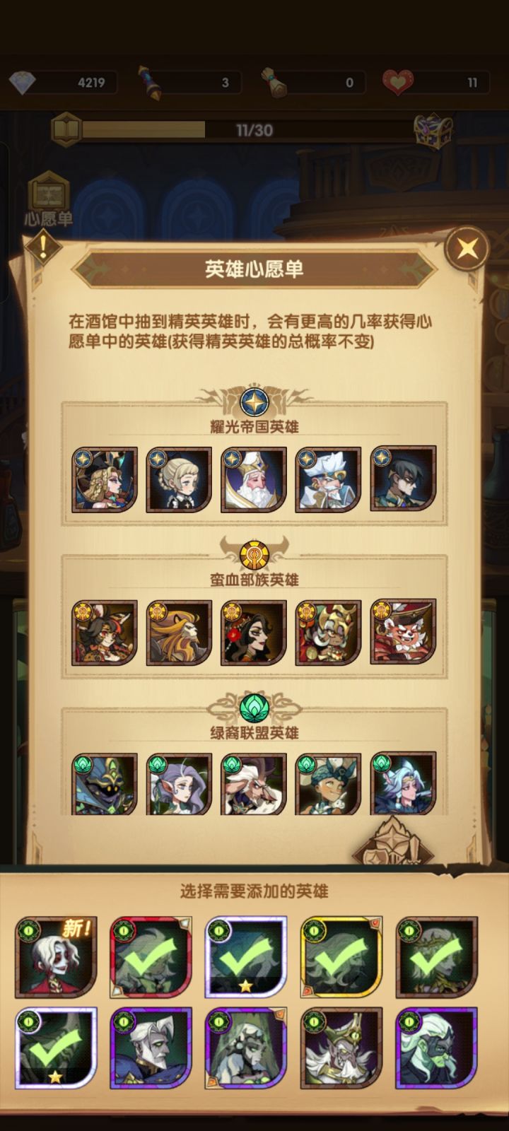 605开服6天,零氪,已经推图29章,感觉不算太慢。我在论坛找了许多攻略,发现都是几年前的,已经不适合当前的版本了。晚上睡不着觉,写点攻略希望对萌新有点点帮助。1。萌新初期推图为主,阵容可以照抄战役热度榜第一,全是亡灵英雄,如图1。没有Sp就随便凑一个。2.心愿单,如图2.3其他英雄除了阵营塔,其他没多大用,但是阵营塔的资源有限,初期没必要浪费资源培养,主要培养推图英雄。其中,绿裔阵营