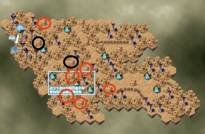 本关难点:你每打一个怪,打完之后都会血量和能量减半。 不要自动,注意用光盾回满血,用商人回满能量。第一遍随便打,熟悉机制的同时把小奖励全拿到手,争取把地图全点亮。第二遍才是正式开始。红色圆圈⭕️的是本关的紫色buff,超级重要⚠️!一定要重置出【冰苍之剑】和【绯炎之剑】,同时拥有两把剑,才能通过本关。如果没有这两个buff,可以无限重置副本,直到有为止。(打第二遍的时候,可以直接在起点处点开红