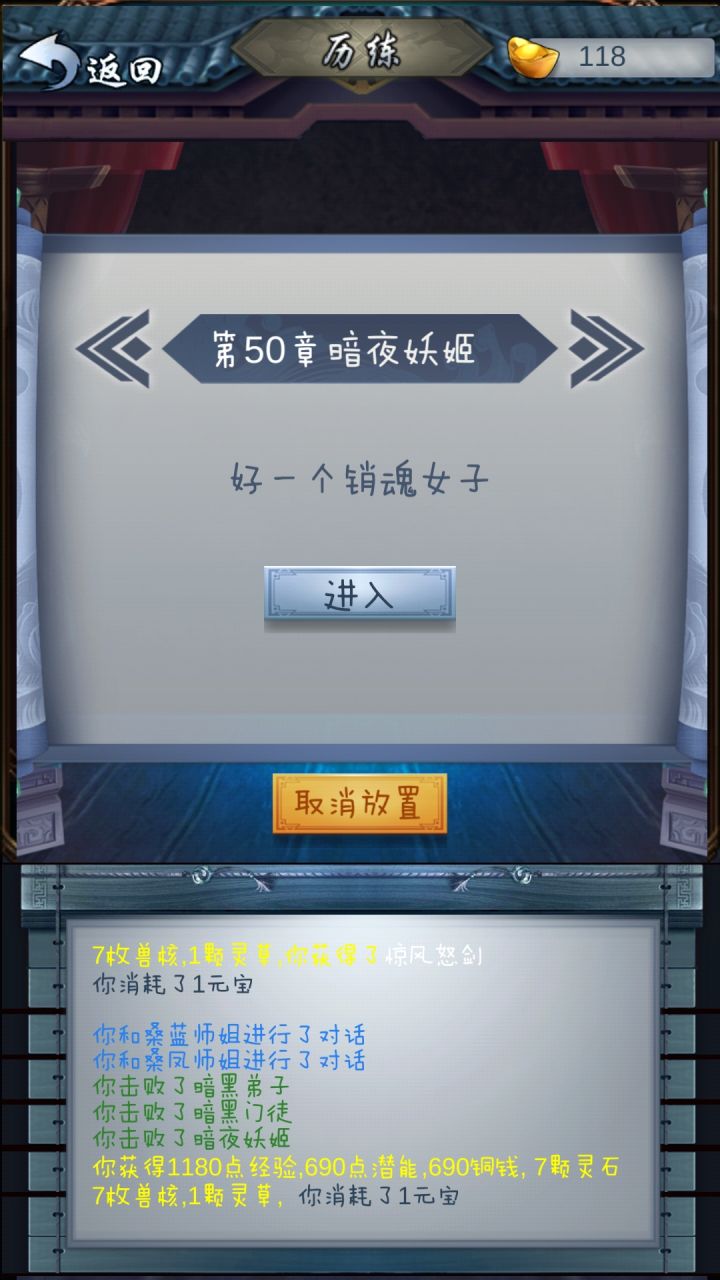 本来是想按大神说的,把血堆到几万,直接打50关。结果攻击太低老是死,被怪打一下4000血,浪费了一个多小时。然后就决定从32关开始推,好吧,BUG就出来了,怪都不反击的。下边上图50关第一个怪50关第二个怪50关第三个怪打完50关后就可以挂机我的招式和装备最后,重新打也还是不反击的。洞府那打好感任务也不反击。