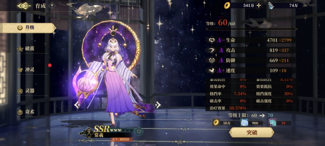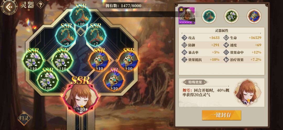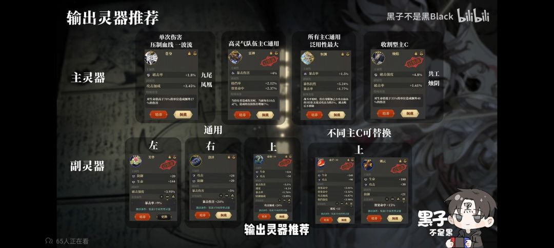 SSR增伤类: 魃:目前的使用经验是低蝶强度不高,不建议萌新使用,外加绝大部分PVE副本没有控制,所以作用不明显,但是爬塔走速杀流派可以带来增伤,不过目前来看低蝶魃完全可以用文瑶替代 灵器方面推荐天号位置(上)带赤芒保证高速能够提前增伤和开免控,其次在地号位置(左)推荐带效果抵抗三件套,因为虽然魃能够帮助队友免控但是自身被控制将无法释放技能,所以增加效果抵抗来保证到魃时能够放出技能,人号位置(右)