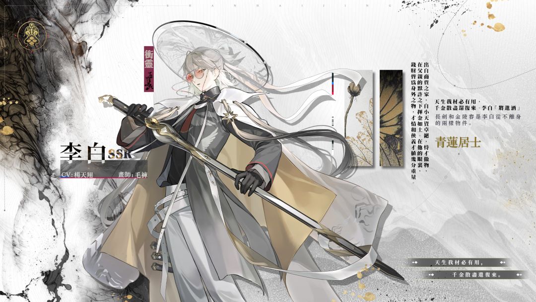 关于李白 “不若与我月下对酌几杯?” 李白,字太白,号青莲居士,又号“谪仙人”,世人口中的“诗仙”。 他出自商贾之家,自小天资卓绝,五岁熟读六甲,十五岁便已创作出多首诗歌,获得当地名流的推崇与认可。 李白年少时,辞乡远游,看遍世间名景,拜访各地名流。他生性洒脱、豪放不羁,心怀修身、齐家、治国、平天下的梦想,渴望在官场上一展政治才华。 于李白而言,钱财皆为身外之物,才情和侠义才值几分重量。长剑和