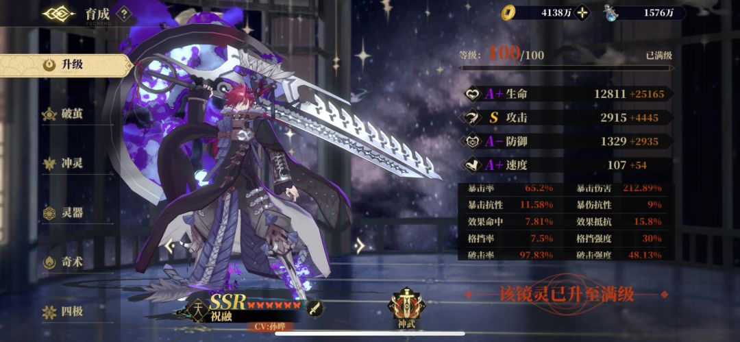 SSR类控制镜灵: 蜚:目前琅琊常客,高速沉默对面后,如果对面没有高速夫诸(且没被沉默)基本上可以双手离开键盘退出游戏,自带免死防集火。且在PVE里面敌人普遍抵抗较低,运气够好应该能够一直沉默怪物降低生存压力。 灵器天号位置(上)前期推荐副词条有效果命中的赤芒,因为前期PVP玩家一般不会去主动堆效果抵抗,沉默半数对手难度不高,PVE的话推荐带锁云堆效果命中,因为PVE怪物速度较慢。地号位置(左)P