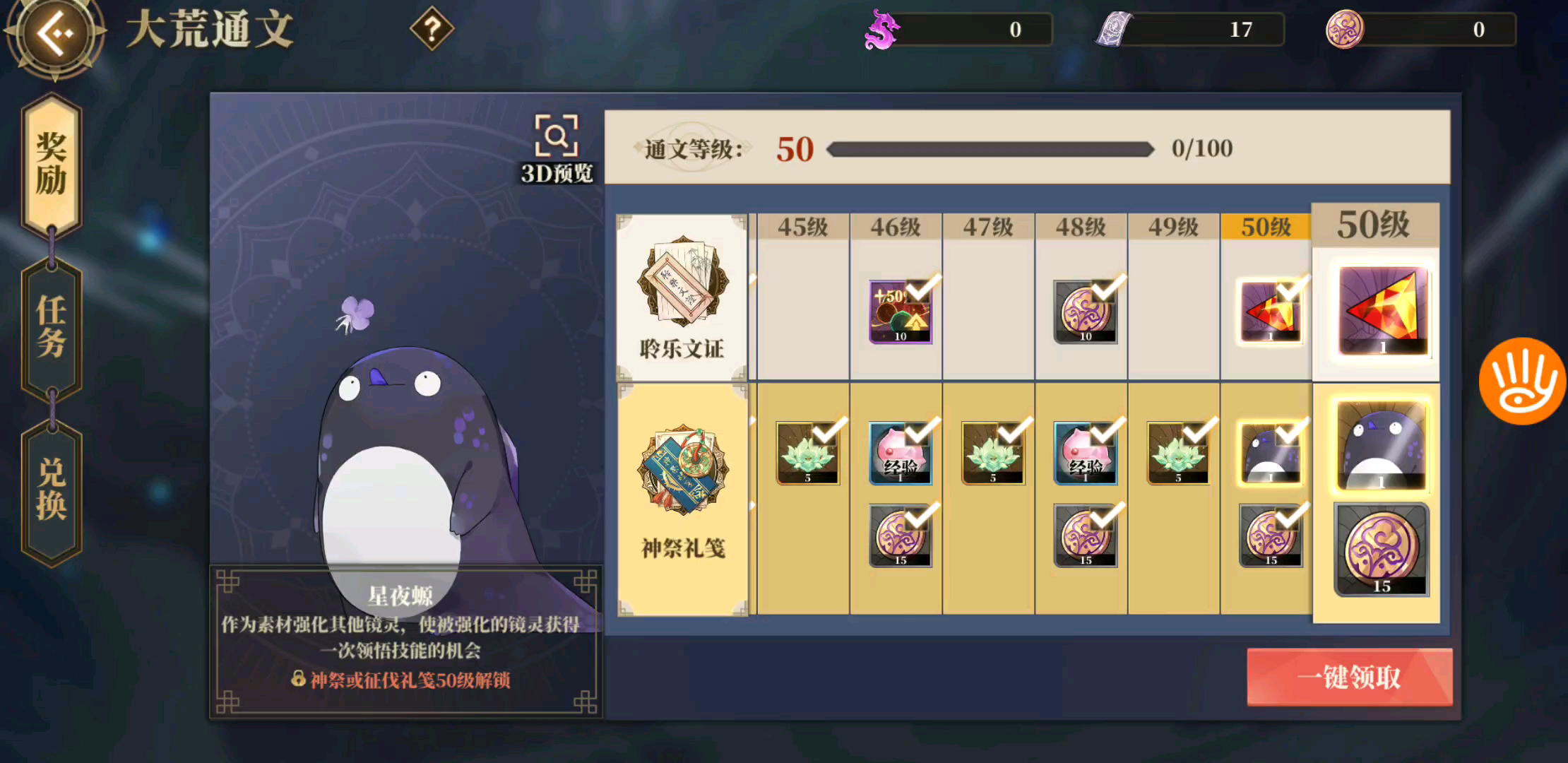 只有我一个人是这样的吗?大荒通文等级上限是50,而且奖励领取之后还是为0