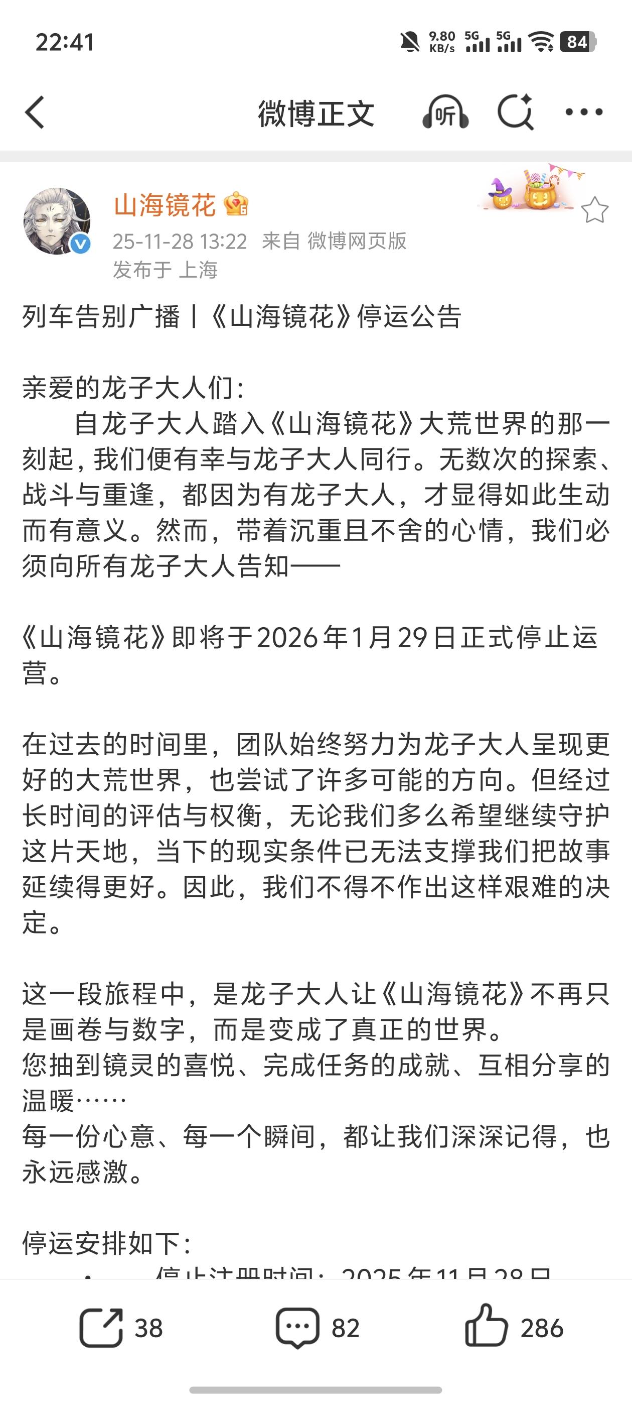#山海镜花宣布终止运营 ⚠⚠⚠——官方公告:2026年1月29日停止服务;11月28日启动停运流程(停止注册),12月29日关闭充值>>>>事件速览游族旗下国风卡牌《山海镜花》于近日发布停运公告:自11月28日起已停止新用户注册,12月29日关闭充值功能,最终在2026年1月29日正式停止服务器并结束运营。官方以“列车告别广播”形式发布公告,并感谢玩家支持,同时公布了数据继承/迁移方