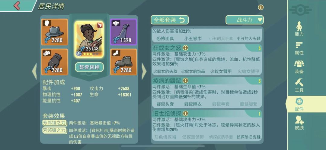 这里主要介绍一些常用和能够出场的人物,至于其他偏门的人物请参照本攻略的佩戴思路, 扬长避短找合适的配件佩戴,辐射避难所OL里面的配件穿戴其实没有一个标准的答案,不同的玩家有不同的佩戴方式,所以更多是结合实际人物技能和能力去合理配搭。 黑人普雷斯顿·加维:主要特点是暴击和高攻 所以根据他的特点,我们选出了两套符合他的套装“芳邻镇之力”“战区格斗者”在实际中芳邻配件更加容易打出高爆数据。 麦克森长老: