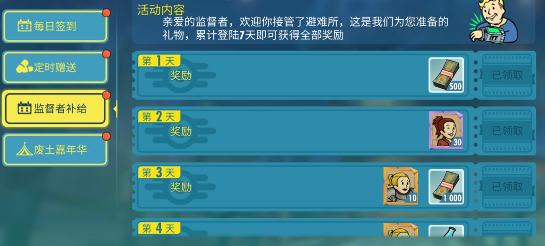 前言 各位监督者进入了避难所,是否为如何获得新的居民(英雄)产生过困扰呢 那么接下来就为大家介绍一下从哪里能够获取怎样的居民(英雄) 获取攻略 一.活动 监督者补给的活动是常见的七日登录活动,避难所OL的七日登录活动可谓是非常的良心了! 第二天登录就可以拿到SR 居民(英雄) 莫伊拉·布朗 这个居民她具有范围AOE输出能力不俗,并且可以降低敌方攻击力是推图的好帮手 七天登录之后就能拿到SSR 莎拉