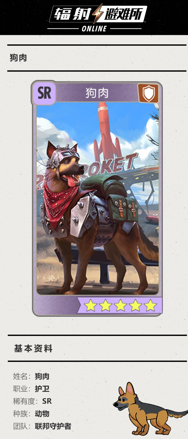 本期我们将介绍的是各位在废土上的好伙伴,虽然它不是人类,但却有着绝对的忠诚,在危机面前会不顾一切地保护主人,它的名字就是狗肉。“汪……”——狗肉