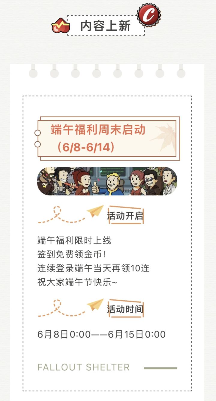 端午就该来废土领取福利!公众号后台输入“端午快乐”即可领取心意小礼包~端午福利限时上线,签到免费领金币!连续登录端午当天再领10连!祝大家端午节快乐~更新详情请见图片内容6月11日更新后——6月18日14:00 #辐射避难所ol #辐射避难所
