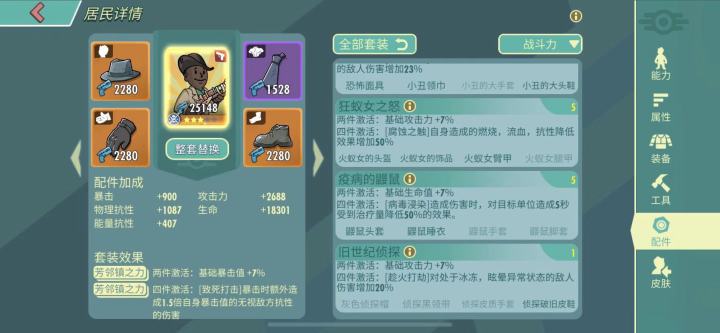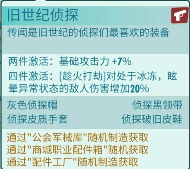 旧世纪侦探套装是一个冷门套装,很多人都感觉用处不大。旧世纪侦探套装由灰色侦探帽、侦探黑领带、侦探皮质手套、侦探破旧皮鞋组成,两件套激活基础攻击力加7%,很适合射手类输出居民佩戴。四件套激活套装属性对处于冰冻、眩晕异常状态的敌人伤害增加20%。 套装通过“公会军械库”随机制造获取(应该是还没有出),通过“商城职业配件箱”随机获取,通过“配件工厂”制造获取。不建议在商城购买非定向箱子获取,护卫装备