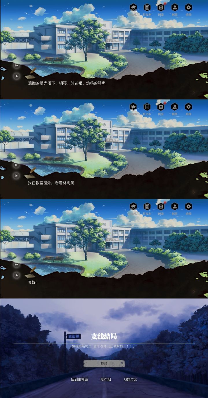 今天我过了两周目,也看了不少前辈们说的一些真结局,但是就在刚刚我发现了一个问题。首先所谓的真结局就是让你了解到了剧情的完整,而某些NPC的未来还是你来决定的,这里的NPC特指林明美。好多人都说;“我打了真结局,真结局里面林明美必须死。”但情况不是这样的。在救完林明美之后,第七章不管你选择自杀威胁,还是语言威胁野蓝放走林明美,都会直接进入支线结局!(所以此刻林明美已经获救了,结局不存在林明美必