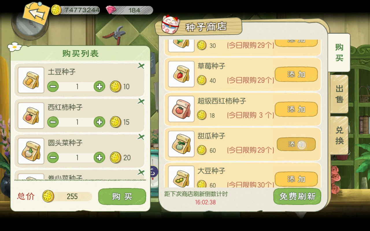 每天都得重复两遍,买种子实在太繁琐啦!希望能在每样种子那一栏加个最大数量的按键。更新之前输完数量之后能跳转到下一个种子,更新之后你自个往下滑吧。真越更新越繁琐。