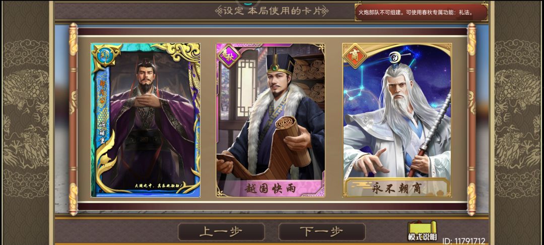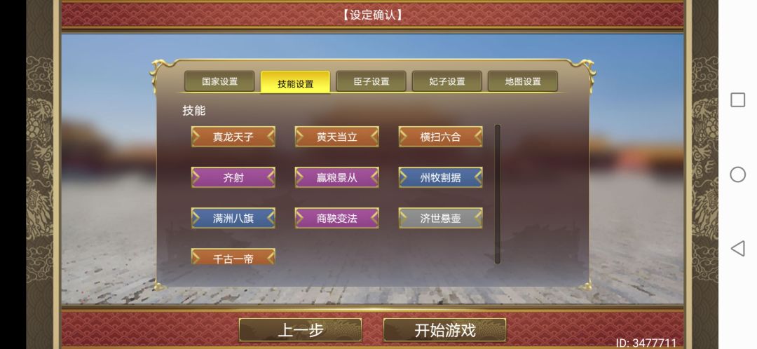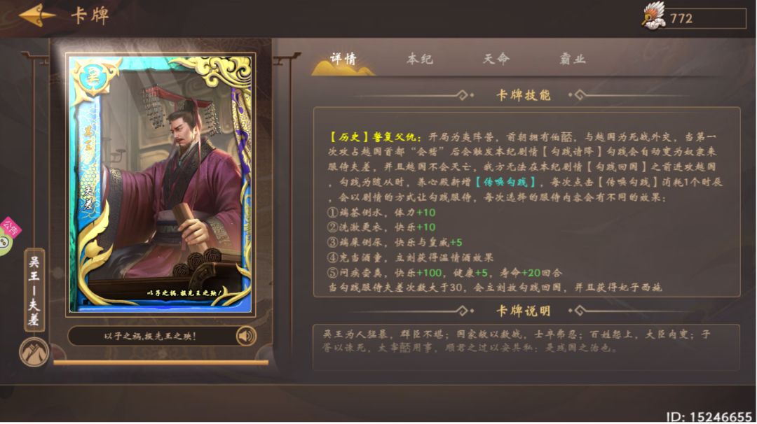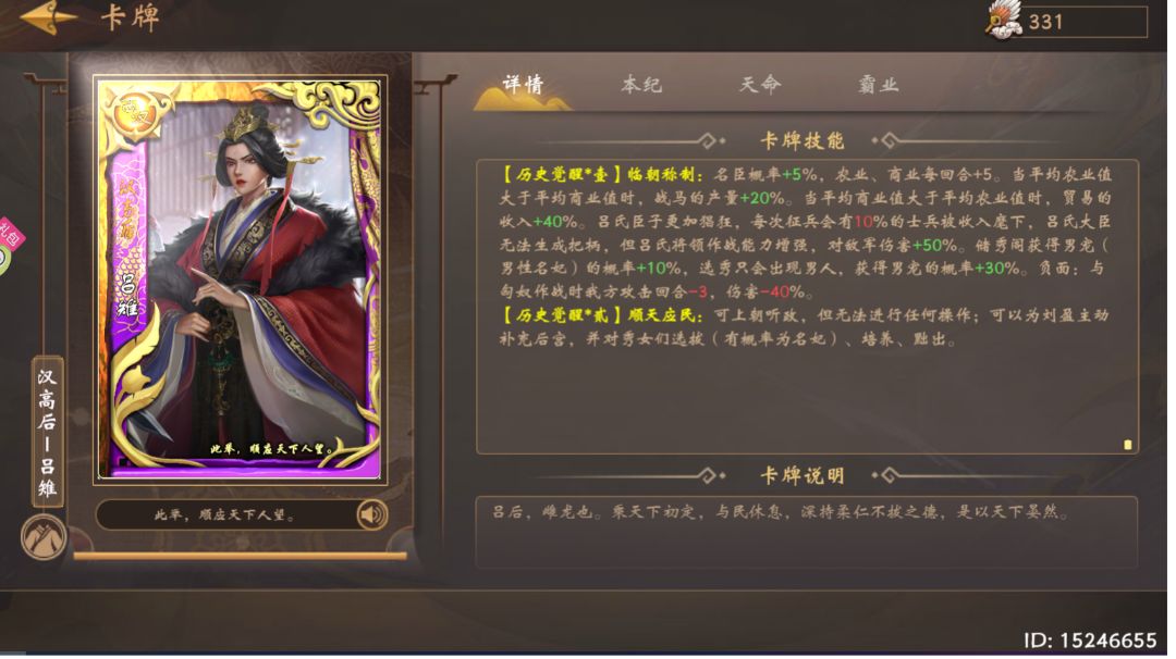 帝卡级别:蓝卡 本纪臣卡:可以带春秋三杰(初始税率+5%,农商矿每回合+2) 本纪妃卡:不需要 高配策卡:天命至现、五月端阳、阅兵戌国 核心策卡:考公记、千变神机、刑徒充军、五行谶纬、嫁妆流三件套(夭桃秾李、烽火戏诸侯、兄友弟恭) 自定义人物佩戴技能: 全属性每回合+5、农商矿每回合+2、储秀阁推荐人数+3 帝卡技能: 帝卡历史技能: 技能方面属于是什么都有,有经济、有战法、有后宫 实际操作: 高