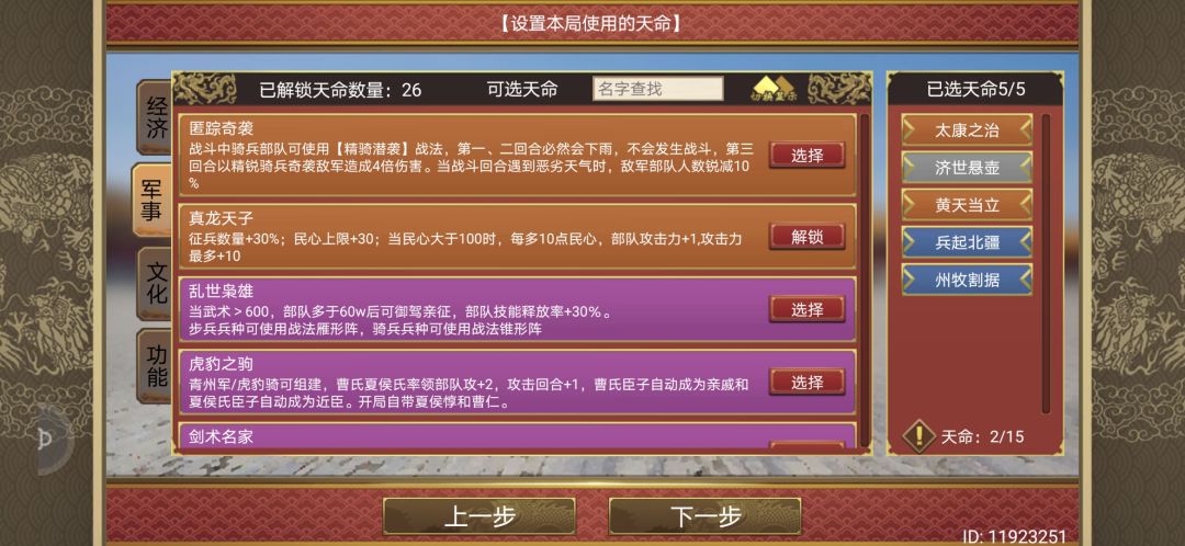 首先挑战三困境我就不重复了,直接说结论。前一年最好不要造武器,你运气好的话抄家抄到500-600万倒是可以造一点,但不能多。接着说贸易。最好是正月两个,二月两个,三月两个。这样又好又能大几率接受贸易。这边建议开局建筑建造顺序为陵墓-匠人-鲁班(同时造一级铁匠)-铁匠和点将台有条件搞个大雁塔同时造基本上就这样就好了。 天命这边我懒得截图,就是黄天+横扫+满洲八旗+幽突+齐射。这套天命好在不用sl。基