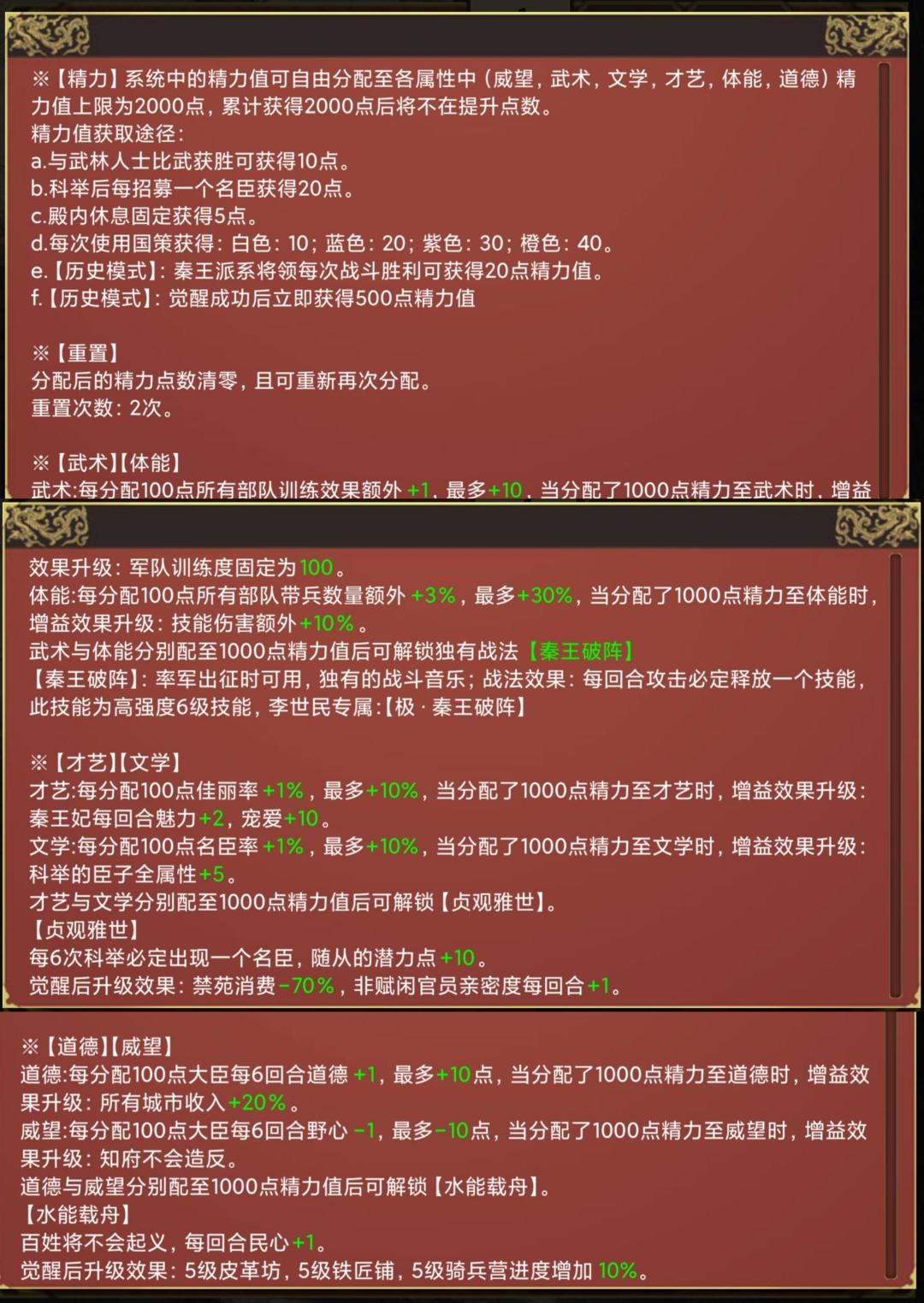 首先,李世民历史模式获取精力途径有五种: 第一种是使用国策 第二种是科举名臣 第三种是与武林人士比试 第四种为殿内休息 第五种为秦王派系将领获胜。 这些机制除了第一种第四种外都是要值得讲一下的。 第三种:武林人生的比试获胜以后但如果被人就走不会获取精力,武林人争斗胜利夺取秘籍不会获取精力,但如果武林人士被击败后有另一位武林人出来求情击败以后将获得双倍精力。 第二种:科举获得的名臣按数量给精力,云湖