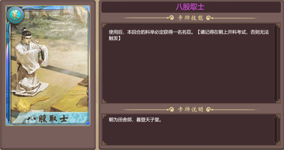 帝卡级别:蓝卡 本纪臣卡:伊尹(历史模式自带) 本纪妃卡:不需要 自定义人物佩戴技能: 农商矿每回合+2 本纪所需策卡: 核心策卡:君子六艺、魏晋风流 ============================== 开局使用君子六艺和魏晋风流,先把需要刷属性的用了,三张策卡也就够了。 使用3张策卡之后触发本纪一。 本纪二触发条件比较另类,别的帝卡都是刷多少多少属性,这个是要求六维属性全部归零,六维属