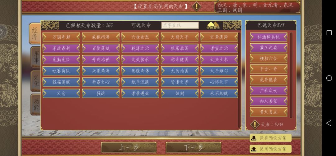 杯酒释兵权:防止叛乱与前期外敌进攻 霸王之姿:省去刷属性的过程 龙舟选美、广采众女:与天桃秾李配合刷妃子与银两 知人善用:配合巡游刷名臣 黄天当立:战争天命不多说 横扫六合:战争天命,后期培养心仪皇子立太子,防止丞相叛乱 千、古、一、帝(不知道为什么全打被屏蔽):buff机配合最强兵种铁鹰锐士