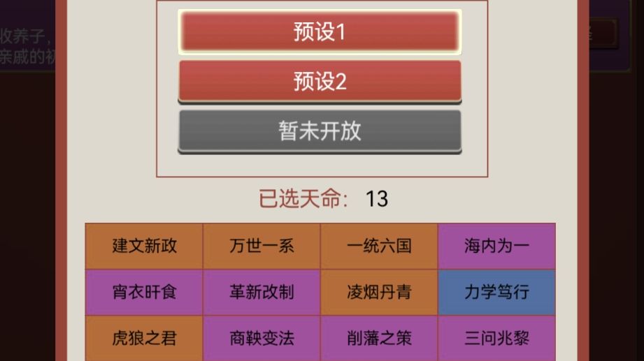 (我现在只有sp秦始皇、朱元璋、康熙,剩下没有,不然还能优化些应该) 1.策卡系天命: 万世一系(刷新策卡)、建文新政(改策卡回合数)、革新改制(半个鸿贤济世)。2.宵衣旰食(刷新所有蓝色策卡包括加皇威上限200的焚书坑儒)、虎狼之君(每100皇威上限加一年在位)达成无限在位 3.海内为一(改农业城市)、商鞅变法(农业建设+7)、三兆问黎(建设方针+200%)、削藩之策(建设方针+50%) 4.凌