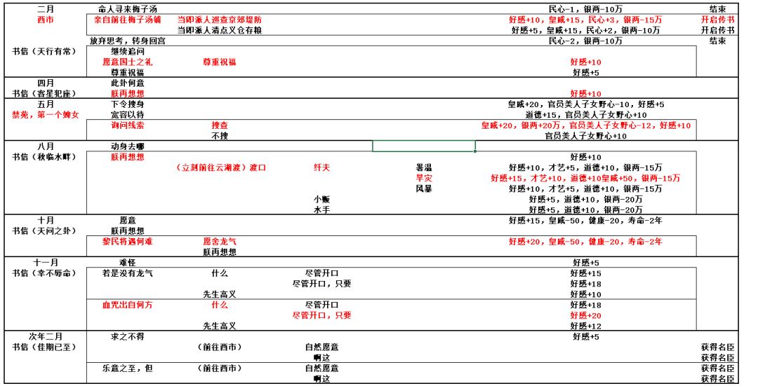 要求皇威和道德≥230 第一年三月郊外左下角《林中小道》 出手相助 回后宫在禁苑一禁苑内务一寄雁传书中收到信件 三月收信《别地风物》 关心 问志趣 五月收信《京城春酿》 能感觉到 答应 五月在京城一 品 楼中遇到江眠 暂且相信 六月收信《行侠仗义》 询问 道阻且长 七月收信《民生多艰》 感慨 八月收信《临别之约》 挑明 答应 九月去郊外云湖渡左下角江眠 不带暗卫 收为名臣 注:最后那里选收为护卫的