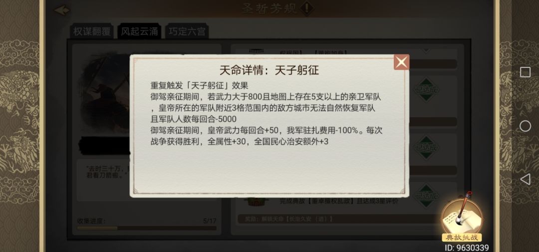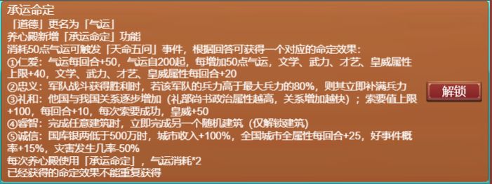 天命搭配 1,题字赋诗(文化)清高宗 在典故中开场会清0文学武术才艺皇威(优先最高) 所以要和文渊参事绑文学,可以在开局进入吏部 2,固国安邦(功能)汉高后吕氏 进入吏部但主要职位不能安排,董卓是丞相是不可以用国策,所以要用(孰可代者)全换了 (这个时间很紧张,韬晦之计一定要用,必须献祭名臣) 3,建文新政(功能)建文帝 全减掉,1好让黄袍加身的太后放弃垂帘听政。 户部民心85才能赶走所以该巡逻的