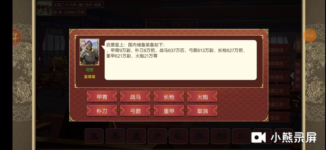 首先官渡之战,需要卡牌【分封制】,随便给袁绍分一个城(ai会帮你打他),或者把所有城分给袁绍以外的一个人,第二回合袁绍灭亡,胜利 然后是徐州之战,需要妲己天命【戈戟曜日】,这个技能的效果是只能招民兵,但是民兵的属性在每月上朝的时候随机一次。 开局招兵招到15w,造一支民兵兵团出来,然后每回合sl一下民兵属性就行了,只要不是攻防都是1,或者己方伤害30对方伤害180这种就行,基本上双方伤害差不多,然