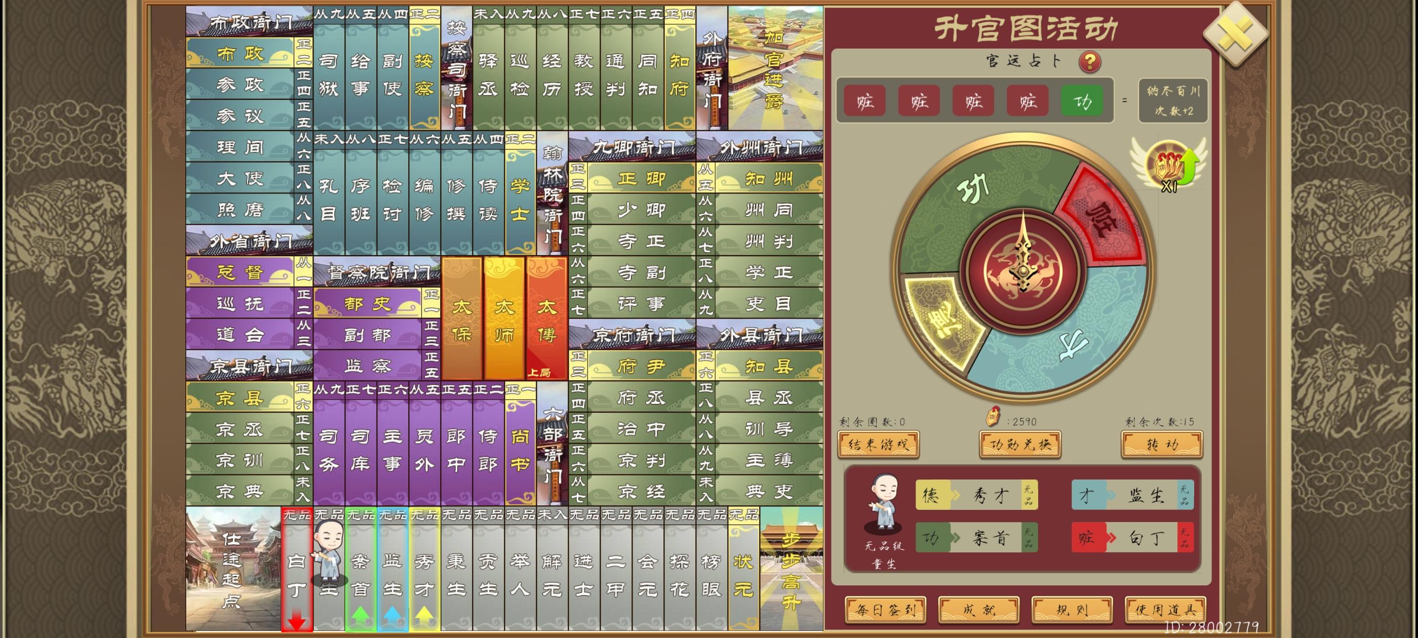 臣卡:不需要。妃卡:不需要。第一回合,四方馆找沈万三,建陵寝,招工匠,用【诸天加护】招神将当丞相。第二回合,招工匠,李世民当中央将军,用【推心置腹】,下朝在养心殿把李世民点成近臣。第三回合,用【宰制朝廷】,下朝后去礼佛寺,完成本纪三。找到沈万三后随便放一个官职,用【工商食官制】,回合设置1,贸易搞钱。陵寝建成后建匠人所。用【天作之合】,回合结束后完成本纪四。匠人所建成后建鲁班坊。鲁