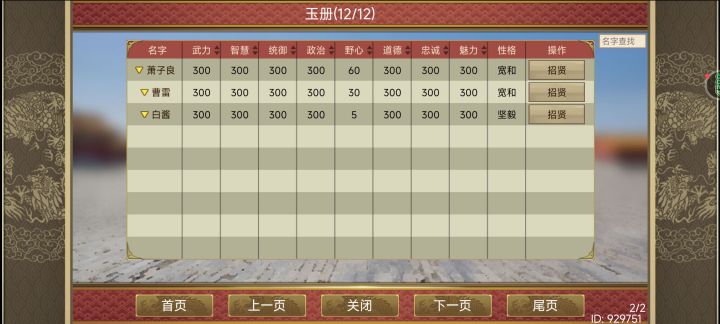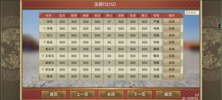 万能:白酱丞相:李悝中央将军:戚继光太傅:曹雷礼:鬼谷子兵:李牧工:鲁班文渊参事:萧子良军团主帅:祖逖、张辽科研:宋应星功能性:王安石可惜召唤下来只能是120属性上限,希望以后能属性多少就召唤多少#皇帝成长计划2