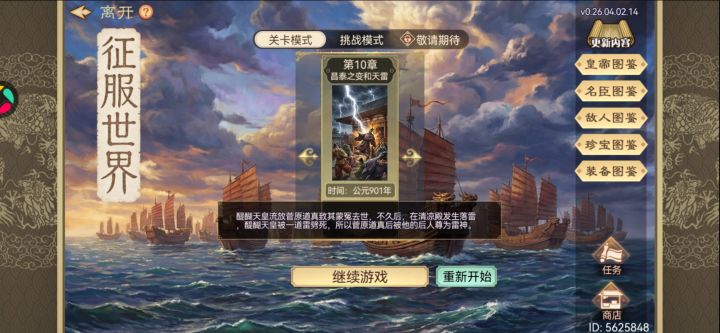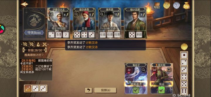 我对这个很不满意,但也真的没招了,难度点满,只用一张紫卡完全打不动(骗你的,两张也打不动,主要是蚩尤五兵完全不生效,不然选个无视防御还能碰一碰。)如图一紫两蓝,天命驱率九黎、吴国盛业、黄天当立、风云突变,还剩下一个位置可以带个经济天命。开局可以用一下紫色策卡三长制加人口,然后征兵,征兵差不多了就直接开打,不点敌方属性增加,是随便打的,点了就完全刮痧,试了好多次,不知道是选的天命不生效还是怎么回事