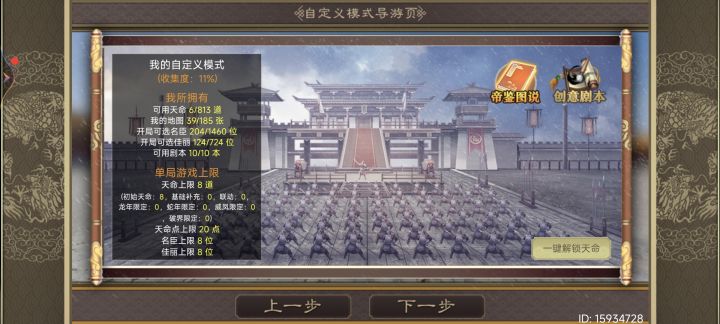 我对这个很不满意,但也真的没招了,难度点满,只用一张紫卡完全打不动(骗你的,两张也打不动,主要是蚩尤五兵完全不生效,不然选个无视防御还能碰一碰。)如图一紫两蓝,天命驱率九黎、吴国盛业、黄天当立、风云突变,还剩下一个位置可以带个经济天命。开局可以用一下紫色策卡三长制加人口,然后征兵,征兵差不多了就直接开打,不点敌方属性增加,是随便打的,点了就完全刮痧,试了好多次,不知道是选的天命不生效还是怎么回事