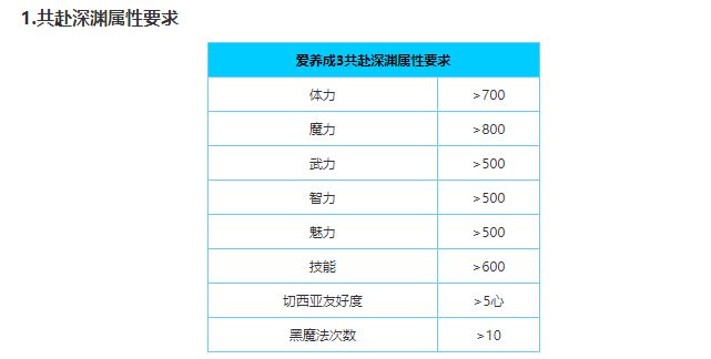 体力>700、武力>700、魅力>700、知名度>600、魔力>500、智力>600、体贴<300、暗属性>600。开局金币3万每月对话加暗属性1年1~11月:治疗课x3,外出(王城x3)x112月:艺术课x3,外出(王城x3)x12年:1~10月:艺术课x3,外出(王城x3)x111~12月:剑术课x3,外出(王城x3)x13年:1~9月:剑术课x3,外出(王城x3)x11