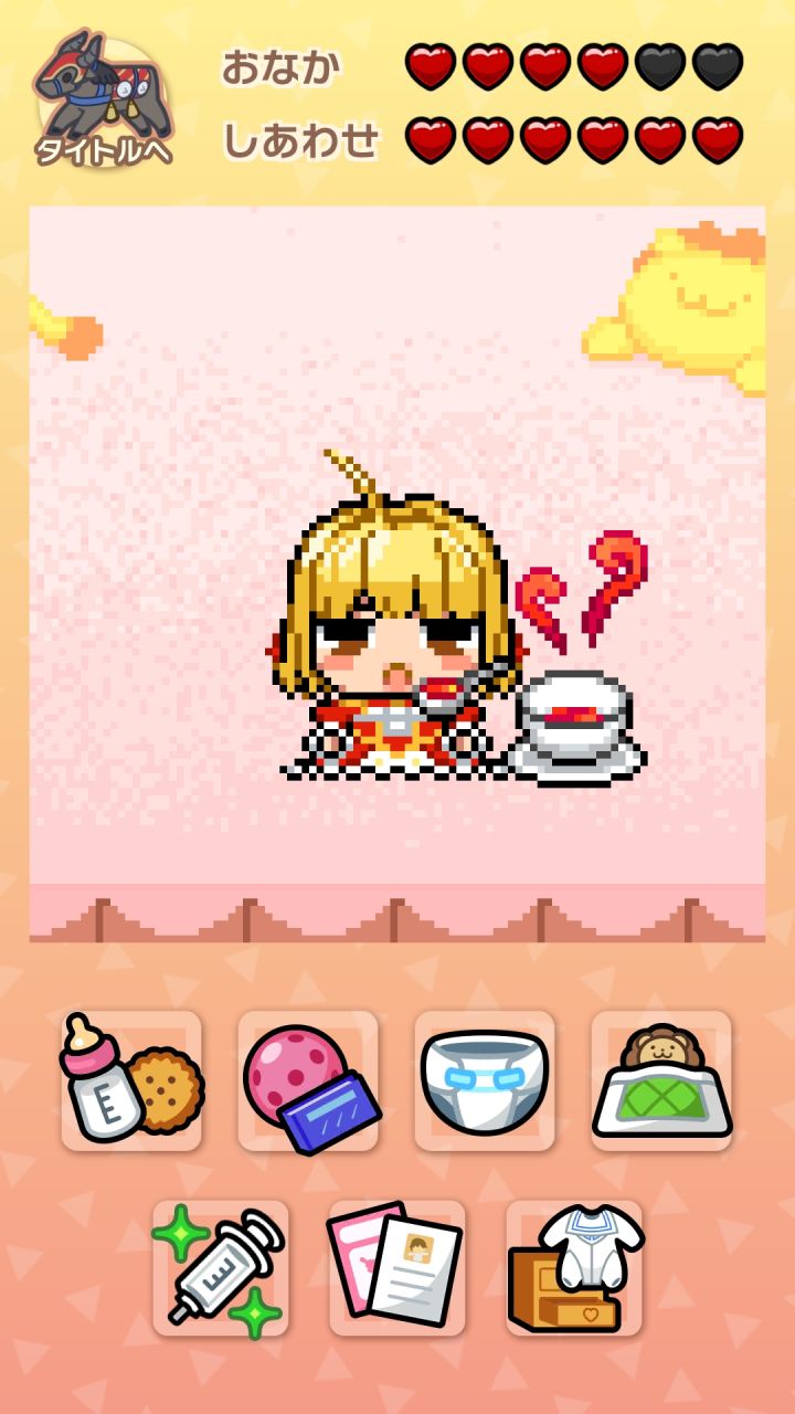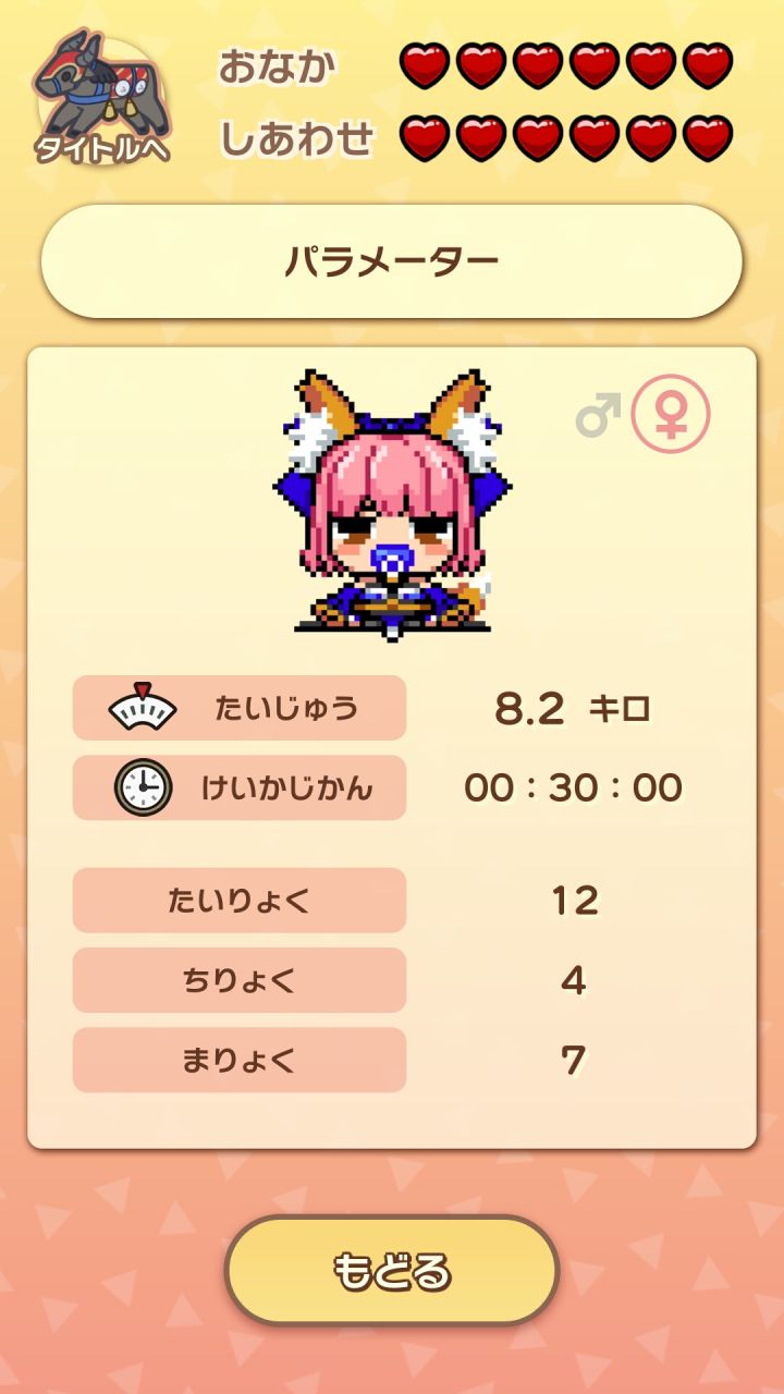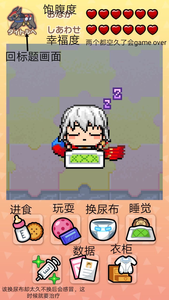 *扎比(子)的饱腹度和幸福度空久了就会game over*大概半个小时到四十分钟会减一颗心*有时候会有第三个选项“手制料理”【多半在♥减了两颗以后才会出现】,可能是尼禄/小玉/龙娘的,到底是谁的是随机,所有人的手制料理加四♥饱腹度*所以我这个强迫症一般一两个小时看一次*尼禄手制料理加体力,小玉手制料理加智力,龙娘手制料理减四♥幸福度,但你可以喂点心加魔力*扎比(子)发出ꉂ的时候可以挨个试