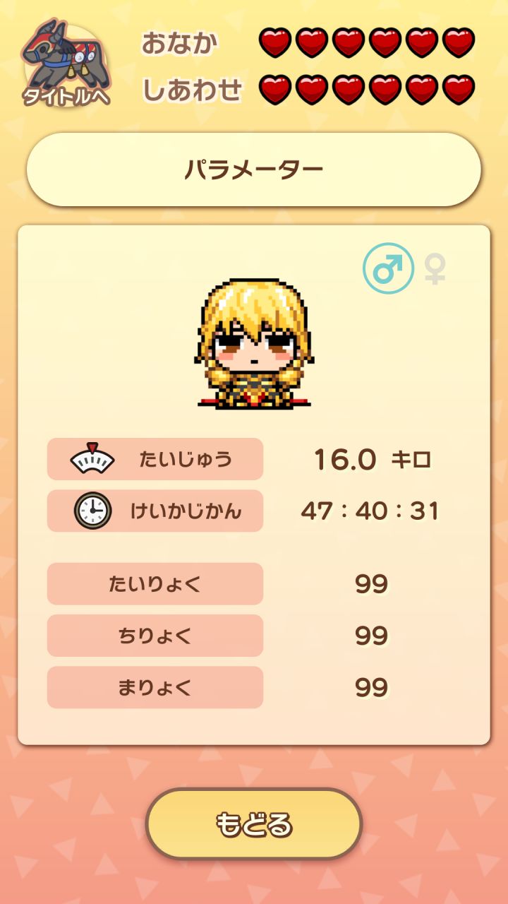 *扎比(子)的饱腹度和幸福度空久了就会game over*大概半个小时到四十分钟会减一颗心*有时候会有第三个选项“手制料理”【多半在♥减了两颗以后才会出现】,可能是尼禄/小玉/龙娘的,到底是谁的是随机,所有人的手制料理加四♥饱腹度*所以我这个强迫症一般一两个小时看一次*尼禄手制料理加体力,小玉手制料理加智力,龙娘手制料理减四♥幸福度,但你可以喂点心加魔力*扎比(子)发出ꉂ的时候可以挨个试