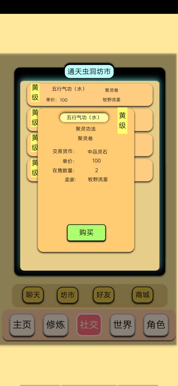 1、《功法》首先介绍功法!为什么先说功法呢?修仙你没有炼之法,还怎么修仙?功法是修炼篇之根本所在,请认真了解。仙资;领悟高级功法,突破新境界所需要之根本。获得仙资;修为提高每一层,增加本境界仙资,境界的突破提升获得高一境界仙资,没有则为零。功法值;功法等级越高级,数值越大,获得修为的基数越大。周天时间;和功法值相反数值越小越好,据说天级功法是1秒。1秒一个周天,就获得一次修