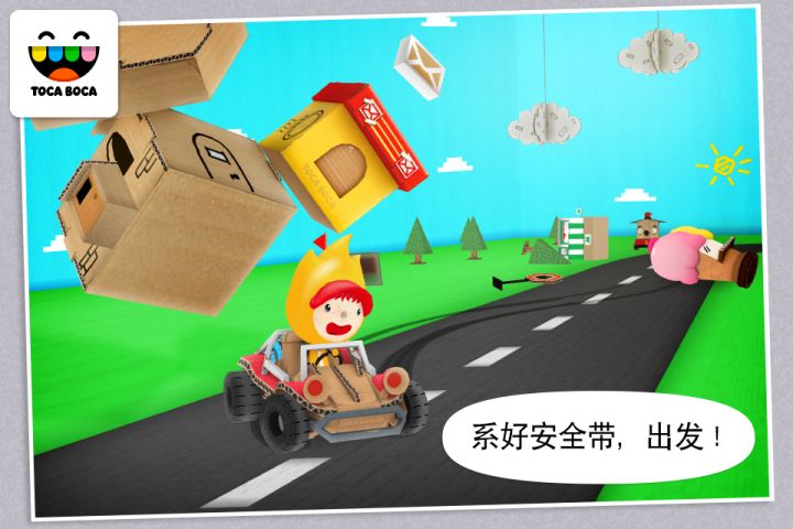 Toca Cars的环境完全由可回收的硬纸板构成,包括可能追在你身后的小狗狗哦!想要快速穿过湖泊,碰一碰树,再撞翻停车标志一次?没有问题!只要按下恢复按钮,就能再来一次!