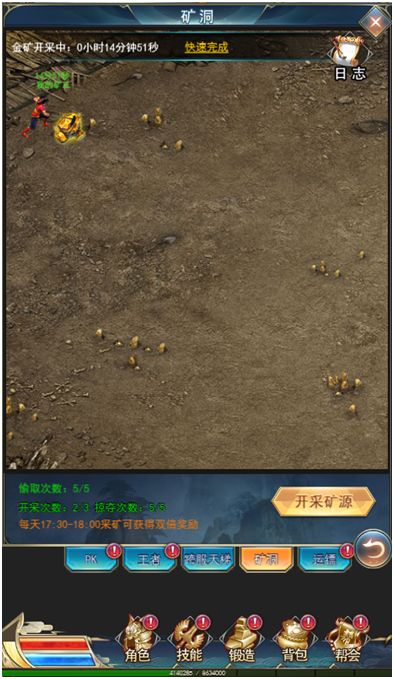 矿洞玩法介绍:(1)玩家2转且开服第3天开启;(2)采矿可获得大量的金币、秘术残页以及功勋,开采的矿源越高级,奖励越丰厚!(3)可通过偷取及掠夺矿源去获得别的玩家丰富的资源;(4)每天17:30~18:00进行采矿可以获得双倍奖励噢!