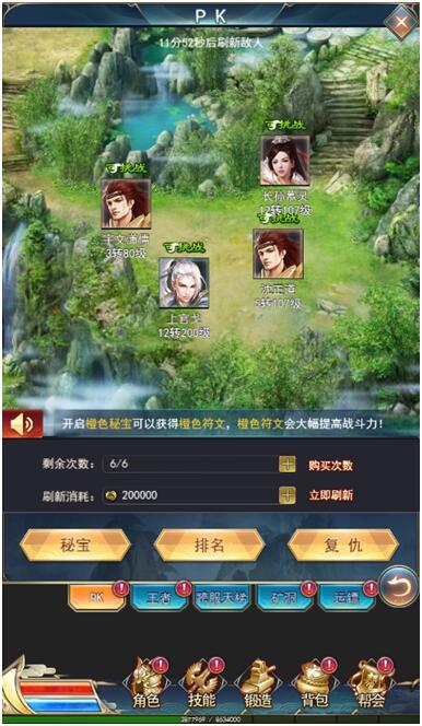 PK玩法介绍:(1)玩家关卡通关到20关即可开启;(2)赢得一场PK有几率获得高阶秘宝,可大幅提升战斗力;(3)可通过复仇击败您的玩家,夺回您的秘宝;(4)每天都有一定的挑战次数,每隔一段时间恢复一次挑战次数,或者使用元宝购买次数;(5)每次结算都有丰厚的奖励,排名越高,奖励越丰富!