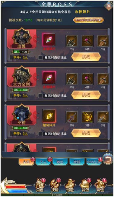 全民boss介绍:(1)玩家可通过挑战全民boss获取丰富的橙装碎片以及各种强大的橙装,4转以上全民boss归属者有机会获得永恒碎片!(2)玩家可以通过击杀其他玩家来抢夺boss归属权,boss归属者4倍奖励掉落!(3)当玩家提升等级后,即可解锁更高等级的全民boss,奖励更丰厚!