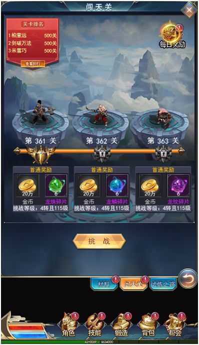 闯天关副本介绍:(1)挑战闯天关,玩家每一次通关都能获取丰富的金币以及龙装碎片!闯天关前段还提供大量经验噢!(2)每天不限次数,玩家可以无限次挑战闯天关,只要你够强,丰富奖励等你拿!(3)每天会根据您当前挑战到的最高关卡结算奖励,奖励巨额的金币以及大量的威名值!