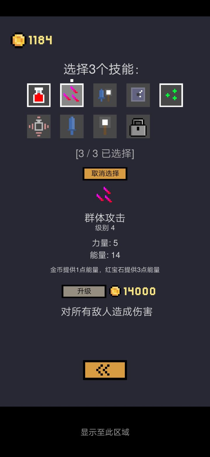 这游戏会玩上瘾,总结一下通关技巧:在活着的前提下最大限度的合成红宝石。最有用的技能:群体攻击、快速充能、道具提升。把这三个被动技能升到最高级,从头到尾用这三个就行,其他技能用处不大。技能充能基本只能靠红宝石,一个红宝石3点,一个金币才1点。随时留意游戏画面左上角的充能剩余点数,充分利用被动技能。例如,道具提升还差3点充满,争取吃一个红宝石(或者三个金币)提升武器数值之后再取武器;攻击怪物也