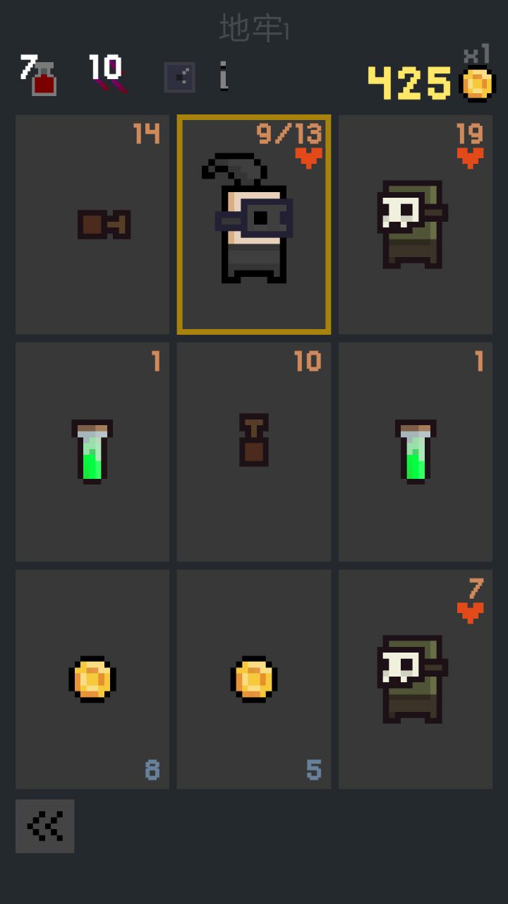 《卡牌地下城》是一款带有卡牌元素的Roguelike游戏,与众不同的是,它以九宫格为地图展现了所有战斗元素,你可以将角色卡片移动到九张卡片上,怪物卡片和陷阱卡会降低你的血量,治疗会治疗你,金卡会增加你的分数,如何移动将决定了你在这座随机的地下城里能走多远。游戏共有7个英雄,单个关卡时间在15分钟以内,新手也能简单上手,随着英雄、技能、道具的增加,你还能组合出有趣的策略,设计自己的打法。游戏可在A