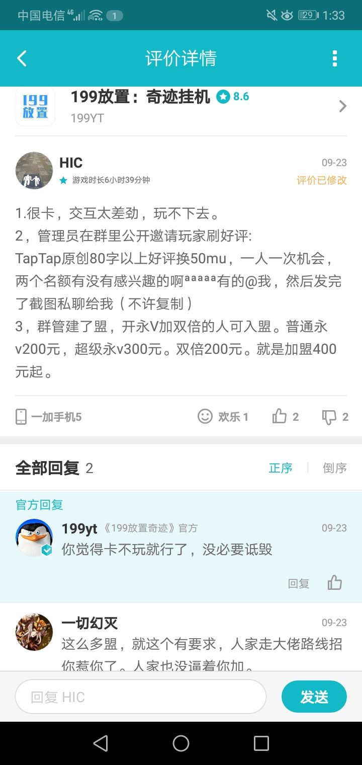 神奇啊,刷五星就算了,别人不喜欢这游戏给一星还会被喷。提建议还不接受,还说是诋毁你们。无言以对,只好顺手举报一下,并且告诉编辑。