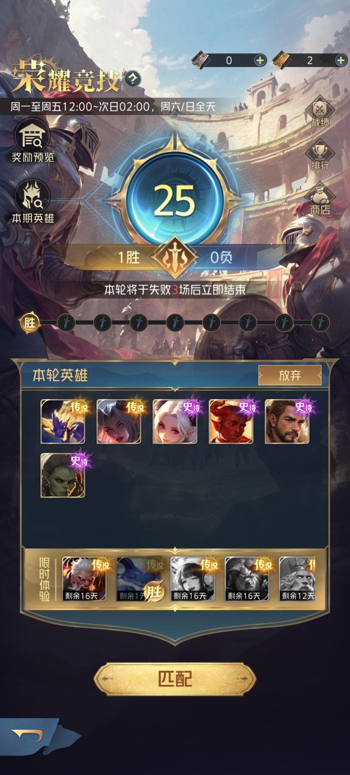 竞技场等选择完英雄再开局?错了错了!!!六英雄都能开局了那理论上零英雄(限时卡池开局)也能开局,在分够的情况下:①点匹配②点放弃③继续开始下一局选英雄,然后卡着等匹配成功(这里我那时候是选了六个开局英雄),实验成功了后来这告诉我
