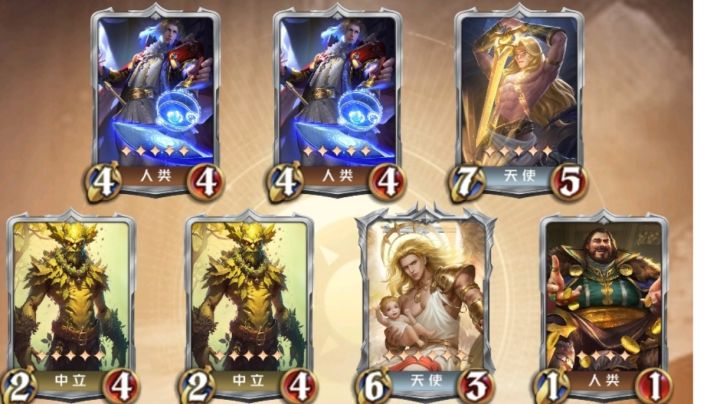 双树人(4,5号位)加大富翁(7号位)保证经济,利用人类的曙光统领(1,2号位)给天使刷属性,曙光圣女(未在图片中展出)大量加攻击力。注意不要让炽天使(6号位)血量成为最低。这个阵容也可以用来养精灵的弓箭手和亡灵的赴死之刃。