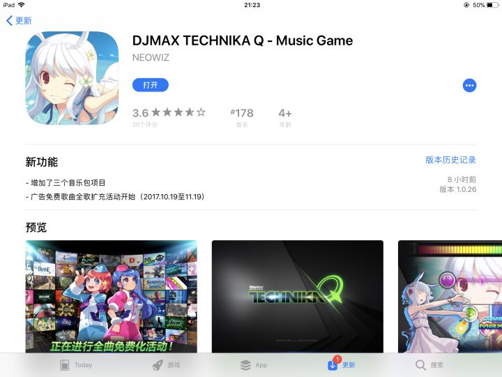 昨晚又更新了两首歌😂观看广告全曲免费活动开始咯,持续一个月,全曲已买的我内心毫无波动😳更新了A7和COS,A7永远压不好判定,两首新歌刷榜无缘就这样吧😭