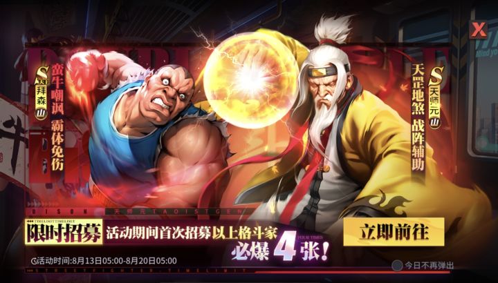8月13日,《街霸:对决》即将开启天师元限时招募活动,拜森限时返场活动也将同步上线!活动时间:8月13日05:00-8月20日05:00活动期间,大家参与招募即有机会获得这位全新的山属性格斗家天师元,同时还有机会将山系老牌均衡型格斗家天王拜森收入囊中。招募期间,首次获得必爆4张!天师元是山队新晋的辅助型格斗家,随着自身形态的切换,能够召唤战阵和符咒为全体友方提供辅助效果,为敌方附加减益效果,