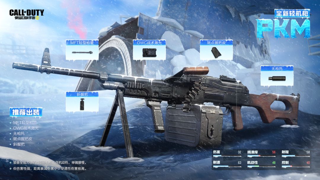 白幕之下枪声依旧响亮,凛冬之末有“大家伙”破冰登场!当3发致命的伤害与“有手就能压得住”的后坐力完美邂逅,当超强的续航能力和出色的穿墙伤害激情碰撞,轻机枪家族的“重磅”新秀PKM吐着火舌高调亮相! 从外观上看,这支和RPD几乎“同一个模子”刻出来的轻机枪,用起来究竟有多“爽”?战士们别慌,本汪新鲜出炉的PKM测评双手奉上! 【六维属性展示】 在六维属性上,作为一支拥有100发默认弹容量的轻机枪,P