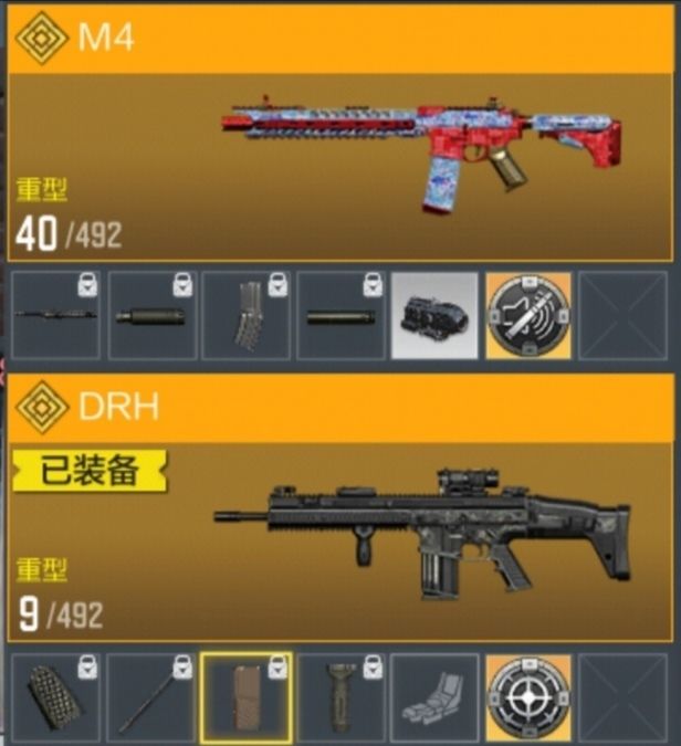 M4 owc射手长枪管 一体成型消音器 无枪托 40发扩容 伤害24 射速68 精准度56 机动性76 距离66 控制54 DCH 颗粒握把皮 owc射手长枪管 游侠前握把 25发开间弹夹 伤害32 机动57 精准度63 机动性76 距离54 控制52 剩下的改天更