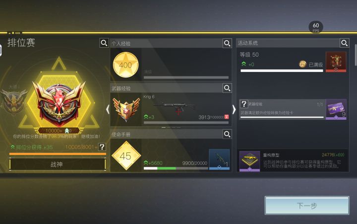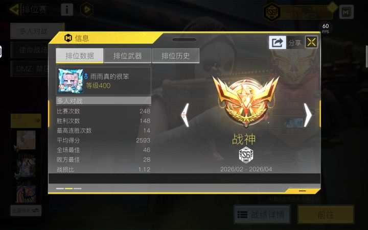 23年底回的坑,24年s3赛季第一次打上战神。25年s3赛季尝试冲过一次万分但只打上9800分。最后在今天成功打上去了。只打热点,现在喜欢用短剑k6。262虽然买了皮肤但是在这个段位打着感觉很吃力只能换回长枪和他们对了。我看现在大伙都喜欢玩点子so14,是这个赛季点子的手感优化了吗?有点想把我丢仓库里的type63传说皮拿出来用用了