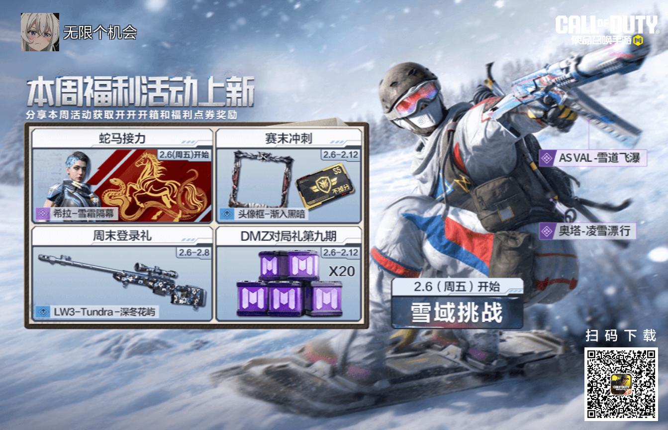 老王化身武功大师传授发财绝技 听到就是赚到! 第一招—— 春节期间,DR MK2-远古神迹、AS VAL-双刃剑圣、Holger26-黑暗曙光、Fennec-无畏 、AMR-亚特兰蒂斯 、M13-黑耀星辰 、CBR4-异源侵蚀 ,7把神话级武器免费体验,回顾使命最初的起点~ 第二招—— 开开开箱新神话级武器AGR-飞翔的荷兰人即将登场,更有超多箱子免费送! 第三招—— 完成任务领好游快爆联动史诗级